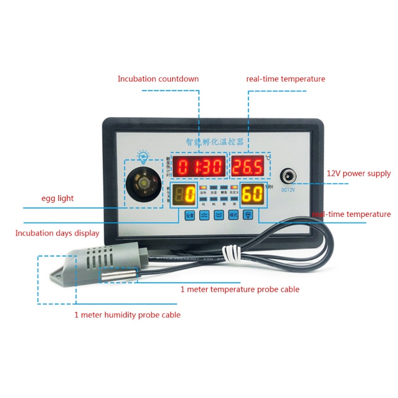 Termostat Digital untuk Pengontrol Suhu Inkubator °Cdc12vname Fitur: baru dan berkualitas tinggi Bahan: Pengontrol suhu digital terbuat dari bahan plastik berkualitas tinggi yang dapat digunakan untuk waktu yang lama. Spesifikasi Utama: Menjaga suhu dan kelembaban dalam kisaran yang diinginkan. Kisaran suhu: 37.3~38.3°C, akurasi ±1%°C? Rentang kelembaban: 50%-70%, akurasi ±5%. Daya: Kami menawarkan 2 jenis pengontrol suhu untuk dipilih, 12W dan 220W. Aplikasi Luas: Pengontrol termostat dengan probe dapat digunakan dalam pembiakan hewan peliharaan, reptil untuk tangki, inkubasi, fermentasi, ikan untuk tangki. Paket Termasuk: 1 Pcs x Pengontrol Suhu, dengan probe 1 suhu dan 1 probe kelembaban.