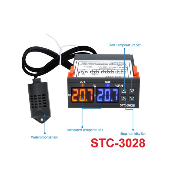 STC-3028 adalah thermostat dan humidistat/hygrostat dalam satu alat, bisa digunakan untuk mengontrol alat pemanas / pemanas dan alat humidifier / dehumidifer sekaligus. Spesifikasi STC-3028: - Tegangan: 110-220 V AC ± 10%, 50/60 Hz - Rentang Temperatur: -20 °C ~ +80 °C - Rentang Kelembaban: 0% RH ~ 100% RH - Resolusi: 0.1 °C - Akurasi: ±1 °C, 0.1% RH - Beban Maksimum: 10A / 240 V AC - Sensor: NTC 1 mtr - Material: Plastik ABS - Berat Bersih: 120 gr - Dimensi: 75 x 85 x 35 mm