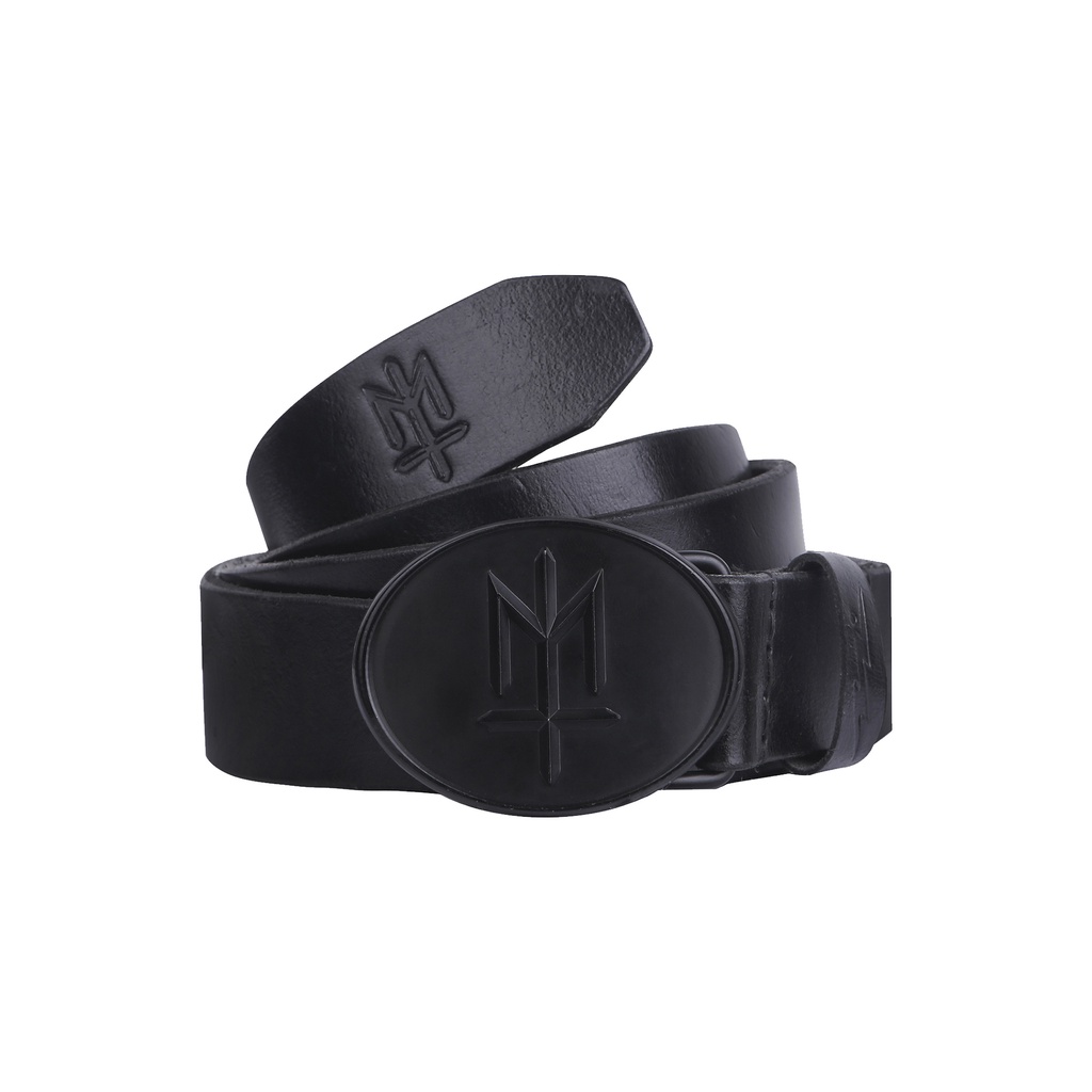 Black genuine leather belt with glossy black buckle and debossed at ending tip.