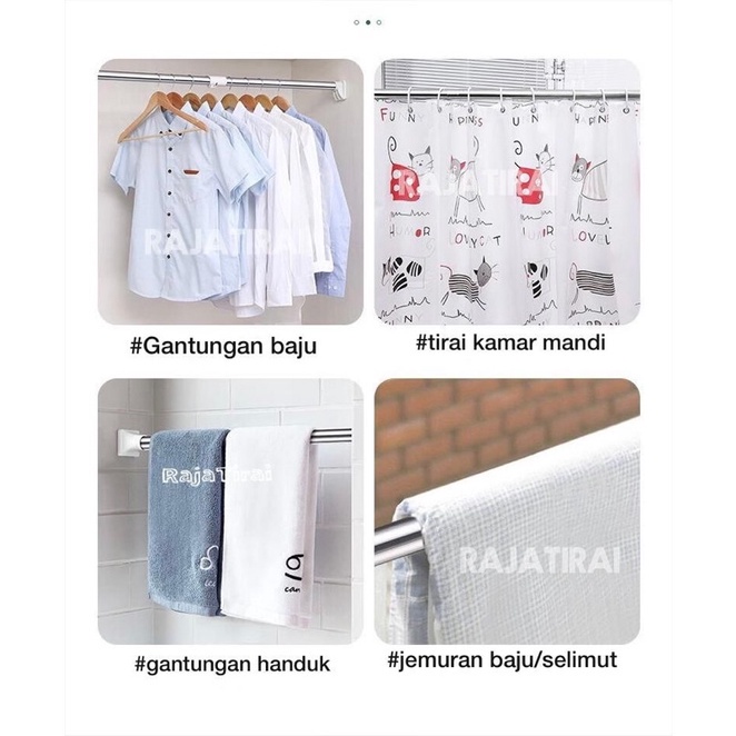 Deskripsi Tiang gantungan serbaguna, dapat digunakan: #Tiang gantungan baju #Tiang gantungan kamar mandi #Tiang gantungan gorden Bahan premium, sehingga tidak mudah patah Panjang tiang bisa diatur dengan varian ukuran panjang yang berbeda