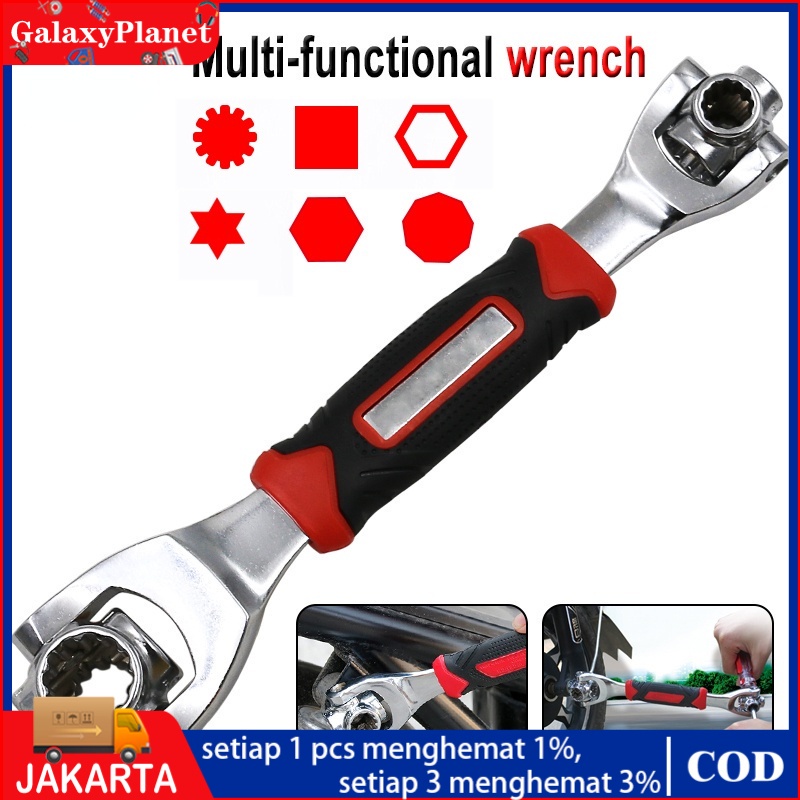 【Features】 Alat yang didesain unik yang menggabungkan 48 alat menjadi satu dan membuat perbaikan menjadi cepat dan mudah Sangat nyaman dipegang dan anti slip Dapat diatur menjadi 45 derajat untuk menjangkau area yang sulit dijangkau mur dan baut Memiliki bahan yang tebal juga tahan banting, alat profesional yang dirancang untuk menangani semua proyek di sekitar rumah, di toko, atau di tempat kerja Cukup diputar dan disesuaikan dengan ukuran yang diperlukan Anda langsung memiliki alat yang Anda butuhkan Ukurannya 25 cm Terbuat dari bahan stainless steel dan pegangan berbahan karet Material Metal