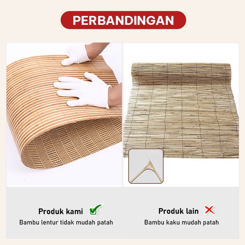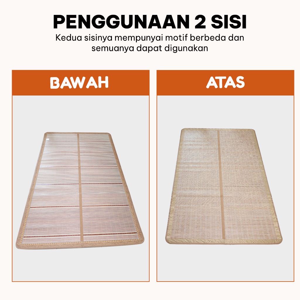 Matras kasur bambu dua sisi ditenun menggunakan mesin berteknologi tinggi menghasilkan rajutan yang sangat halus dengan tampilan elegan dan mewah. Teknologi pendingin alami membuat badan lebih sejuk saat suhu panas tanpa menggunakan AC. Penggunaan 2 sisi kedua sisinya mempunyai motif yang berbeda dan semuanya dapat digunakan. Pelindung kasur antara sprei dan kasur anda yang melindungi dari noda dan kotoran sehingga dapat memperpanjang usia kasur anda.