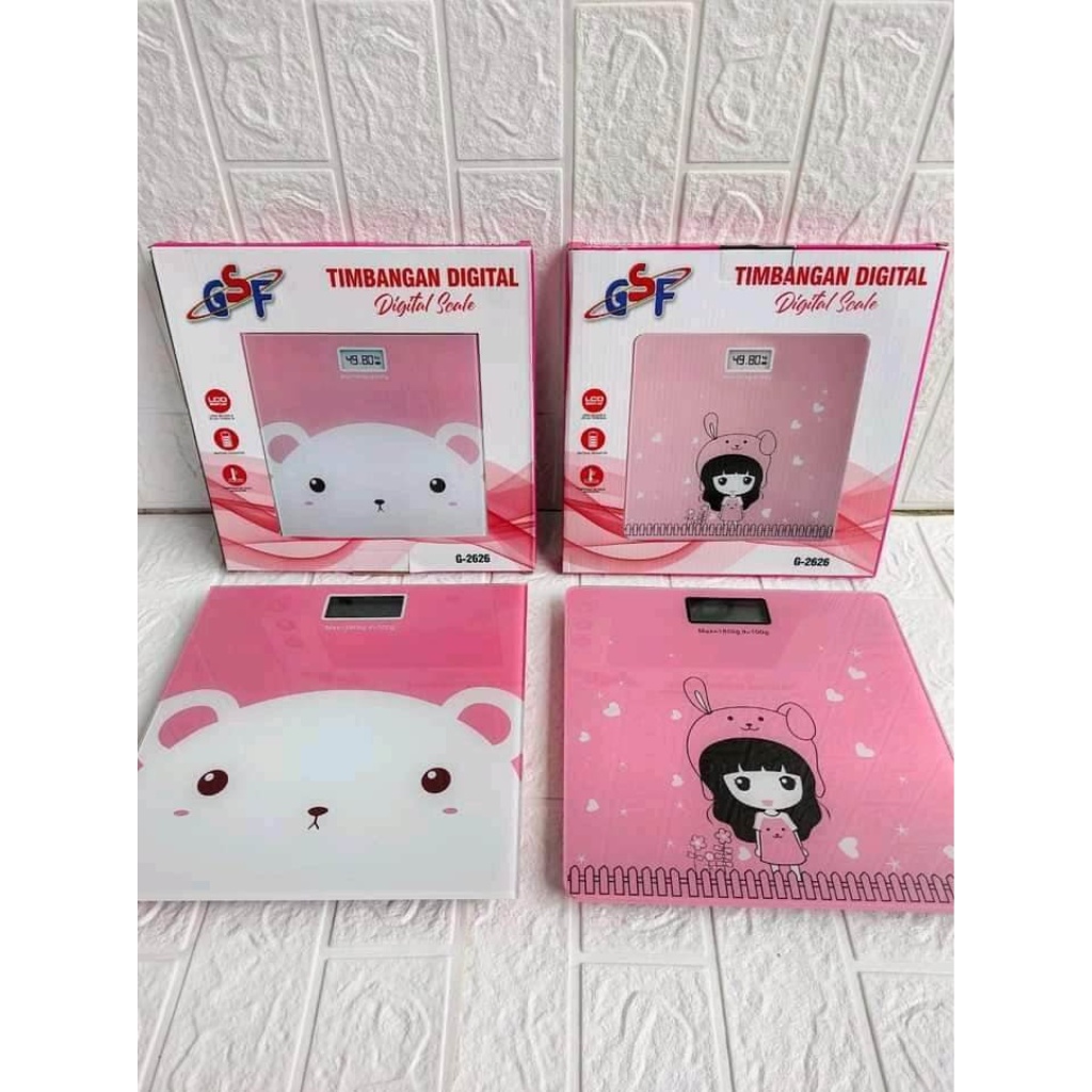Timbangan untuk mengukur berat badan, memiliki bentuk kotak yang minimalis disertai dengan tampilan gambar kartun pada permukaan timbangan. Mampu menampung berat badan hingga 180kg.
