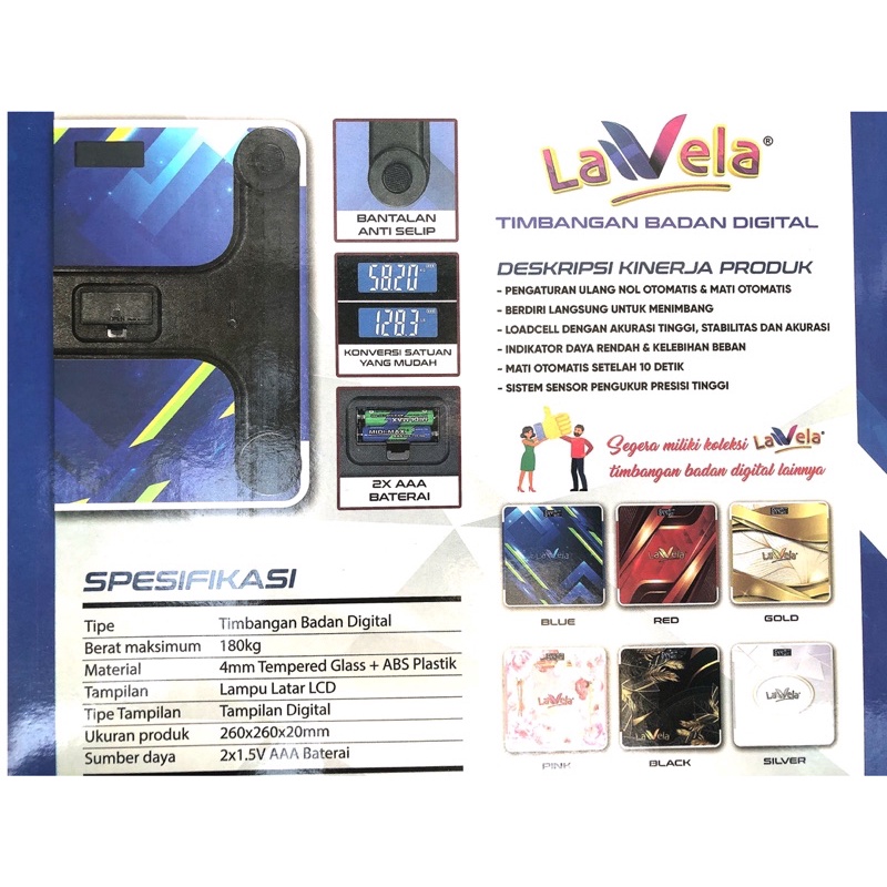Merk: lavela Tipe: timbangan badan digital Berat maximum:180kg Matrial: 4mm tempered glas + abs plastik Tampilan: lampu latar lcd Tipe tampilan: tampilan digital Ukuran produk:260mm x260mm x 20mm Sumber daya:2x1,5v AAA baterai Bantalan: anti selip Konversi satuan yg mudah