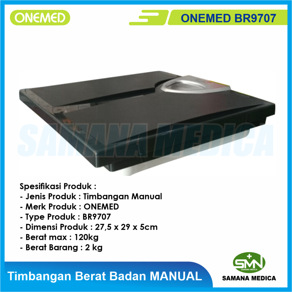 Spesifikasi Produk : - Jenis Produk : Timbangan Manual - Merk Produk : ONEMED - Type Produk : BR9707 - Dimensi Produk : 27,5 x 29 x 5cm - Berat max : 120kg - Berat Barang : 1,8 kg