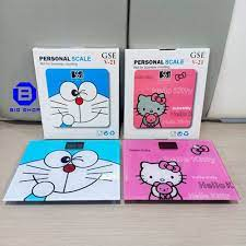 Timbangan untuk mengukur berat badan, memiliki bentuk kotak yang minimalis disertai dengan tampilan gambar kartun pada permukaan timbangan. Mampu menampung berat badan hingga 180kg.