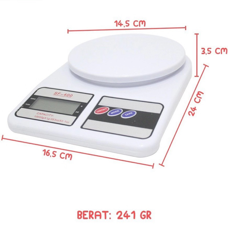 Spesifikasi: 1. Kapasitas 5 Kg (5,000 gr) 2. Ketelitian 1 gr 3. Power: 2 baterai (AAA) TIDAK TERMASUK 4. Dimensi Timbangan : 24 cm x 14.5 cm x 3.5 cm