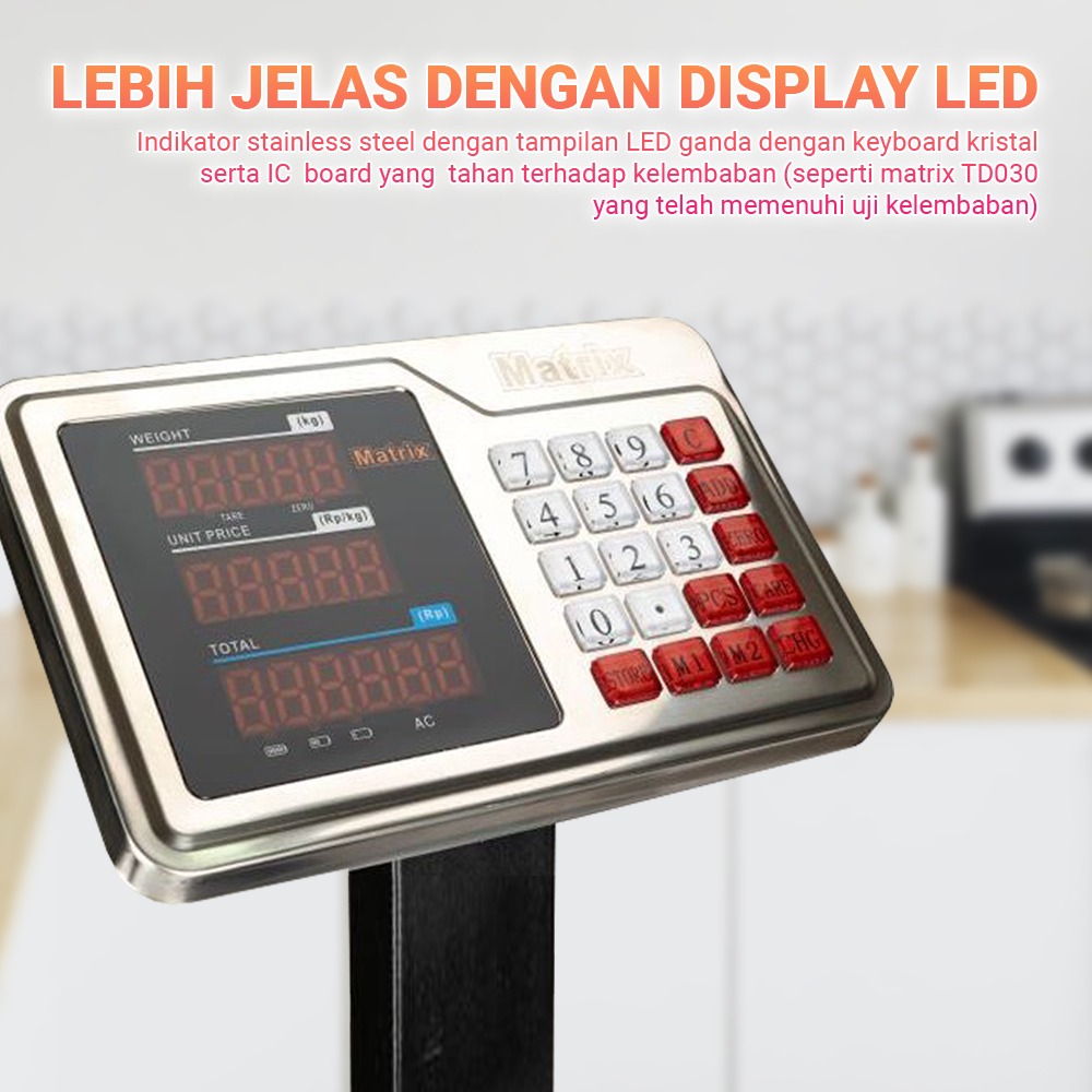 Timbangan digital matrix dapat memudahkan anda untuk memudahkan aktivitas bekerja dengan tepat dan akurat. Kapasitas maksimum hingga 300kg. Hal ini membuat timbangan yang ideal untuk berbagai jenis kebutuhan seperti pabrik, toko-toko, dan petualangan lainnya.