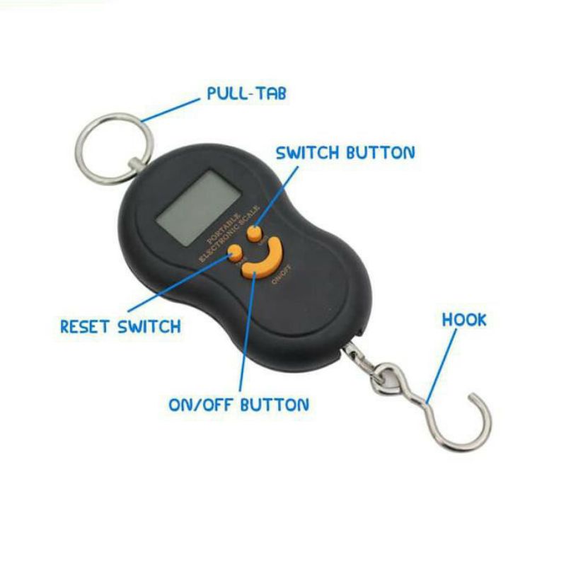 Fitur Timbangan : + Tombol tare : Untuk menimbang berat bersih + Tombol unit : Untuk menentukan satuan ukur + Tombol on/off : Untuk menyalakan atau mematikan layar + Kail atas : Untuk menggantung timbangan + Kail bawah : Untuk menggantung benda yang akan ditimbang