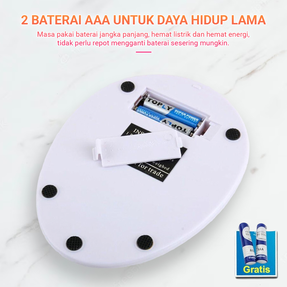 KELEBIHAN : - Power akan "OFF" otomatis beberapa detik jika tidak digunakan - Indikator Jika Power Lemah - Indikator "EEEE" pada display, Jika berat melebihi maximum - Menggunakan 2 jenis ukuran: Gram & OZ - Membantu memadukan kadar bumbu masakan dengan presisi timbangan yang akurat - TARE (Jika kita menggunakan wadah tambahan seperti mangkok dll, pada timbangan, dapat disetting NOL "0")
