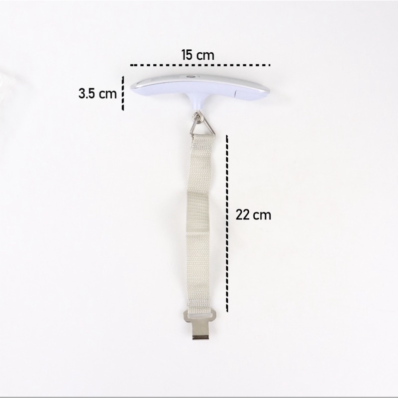 Material Bodi: Plastik Tali: Poliester dan Stainless Steel Dimensi Bodi: 15 × 3 × 3.5 cm Panjang Tali: 22 cm Lain-lain Kapasitas: 50 kg Resolusi: 10 g Baterai: 1 × CR2032