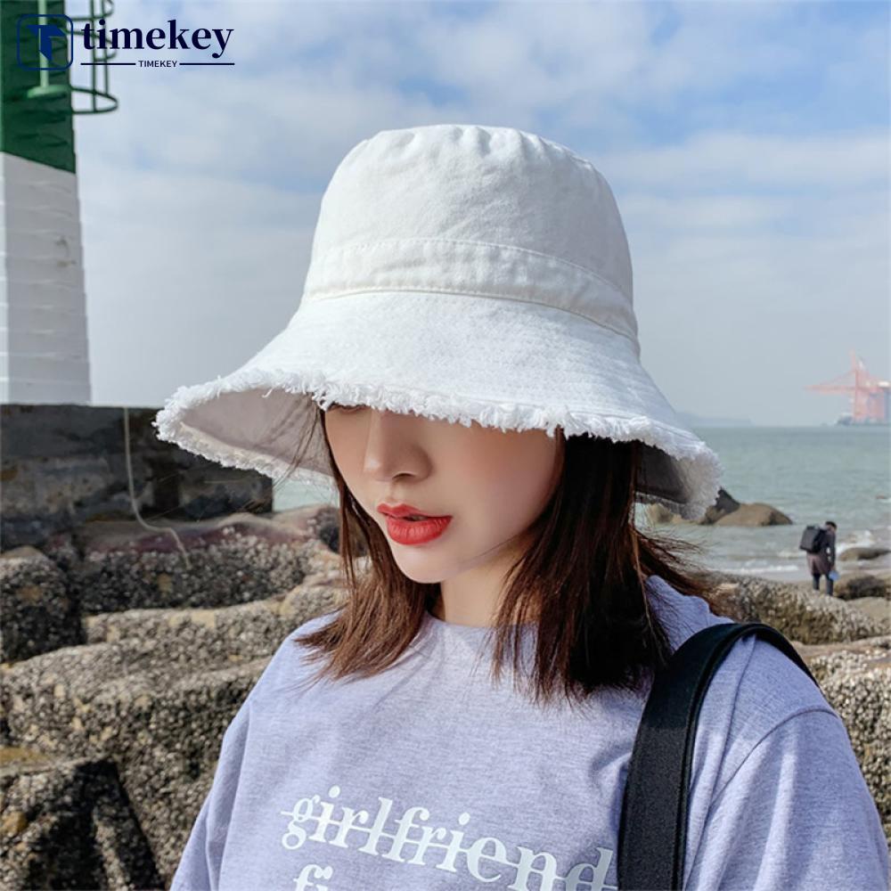 Detail Timekey Wanita Topi Nelayan Outdoor Topi Perlindungan Matahari Warna Solid Raw Edge Fashion Topi Sederhana M1N7
