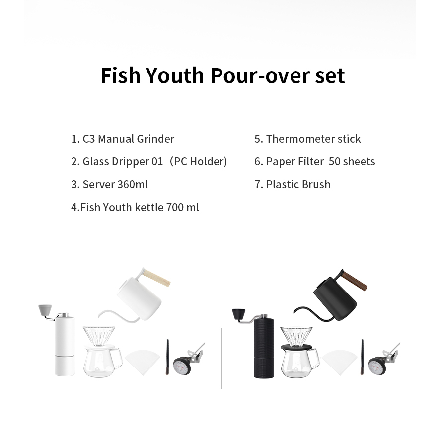 timemore C3 Pour Over Set Fish Youth kemasan gift box tersedia warna black dan white barang terdiri dari 1) C3 2) Glass Dripper 01(PC Holder) 3) Server 360ml 4) Fish Youth Kettle 700 ml (black / white) 5) Thermometer stick 6) Paper Filter 50 sheets 7) Plastic Brush harga tertera tidak termasuk cangkir , kelengkapan sesuai yg ada di list cocok digunakan sebagai hadih atau koleksi
