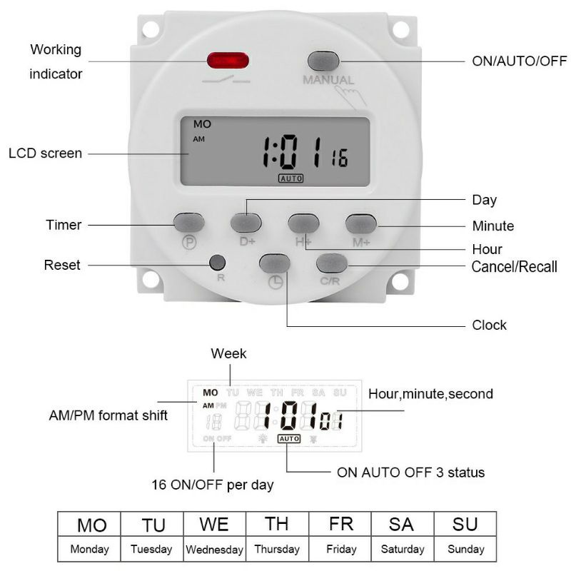 Opsi program dapat diatur sampai 8 macam program sebagai berikut: Opsi Pertama, Minggu. Opsi kedua: dari Senin sampai Jumat. Opsi ketiga: Sabtu dan Minggu (weekend). Opsi keempat: dari Senin sampai Sabtu (hari kerja). Opsi kelima: Senin, Rabu, Jumat. Opsi Keenam: Selasa, Kamis, Sabtu. Opsi Ketujuh: dari hari Senin hingga Rabu. Opsi Kedelapan: dari Rabu sampai Sabtu. 12 jam dan 24 jam Tips: 1. Sebelum memulai program, timer harus di sambung dengan tegangan 220V AC selama 5 menit untuk mengisi baterai 2. Sebelum pengaturan program, tekan tombol tombol reset, untuk menghapus data untuk instruksi baru. 3. Setelah program ini dibuat, silakan sambungankan timer di bagian switch sesuai dgn kebutuhan daya
