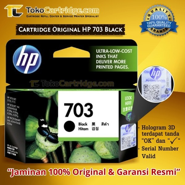 Spesifikasi Cartridge HP 703 Black : • New Original Box • Warna Black • Garansi Resmi HP • Kapasitas Cetak 600 lembar