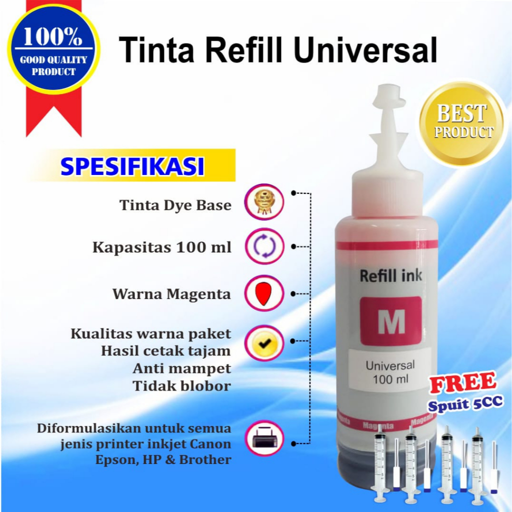 - Tinta Dye Base - Kapasitas 100 ml - Warna CMYK(Cyan Magenta Yellow Black) - Kualitas warna pekat - Hasil cetak tajam - Anti mampet - Tidak blobor - Tutup Model Krucut, dapat mempermudah proses pengisian ulang tinta pada catridge