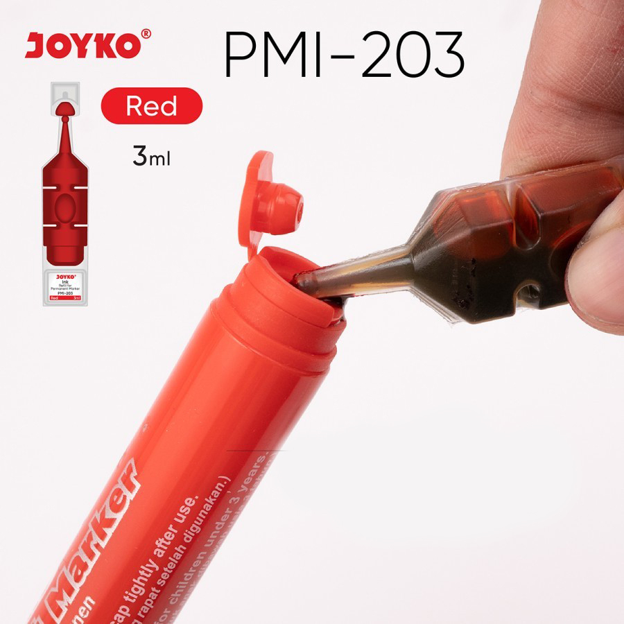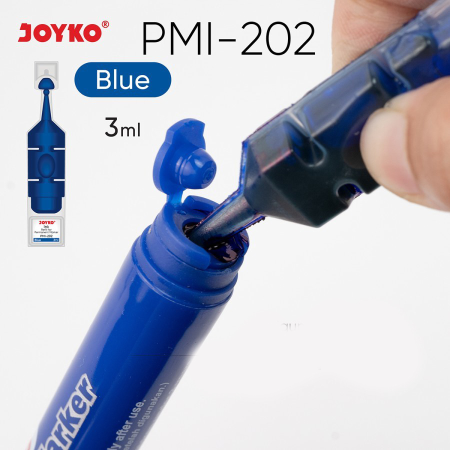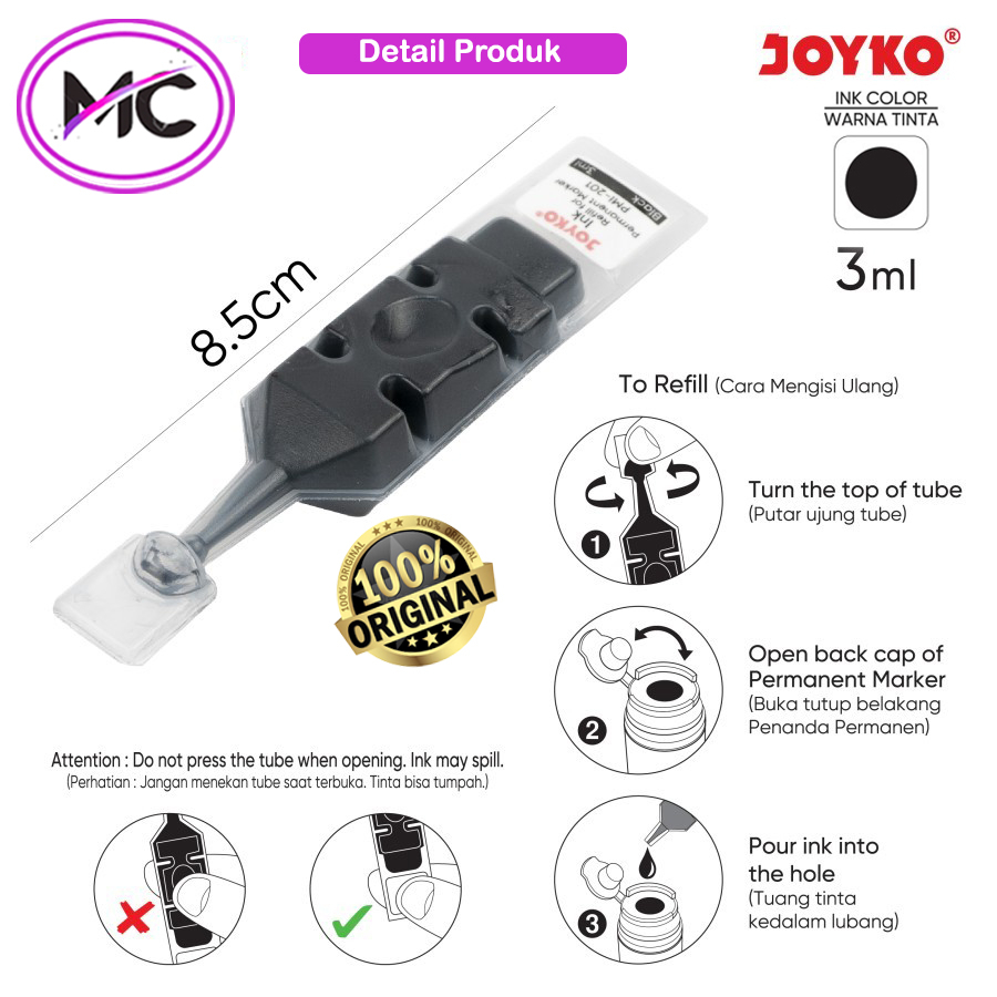 Spesifikasi Produk: - Merk: JOYKO - Kode: PMI - Warna: Hitam, Merah, Dan Biru - Tipe: Permanen (Tidak Dapat Dihapus) - Bahan: Plastik - Isi: 3ml / Pcs - Keterangan: Tinta untuk refill spidol permanen segala merek, cukup potong kemasan dan tinta bisa langsung dituang, sangat praktis dan menghindarkan dari resiko tumpah atau tercecer