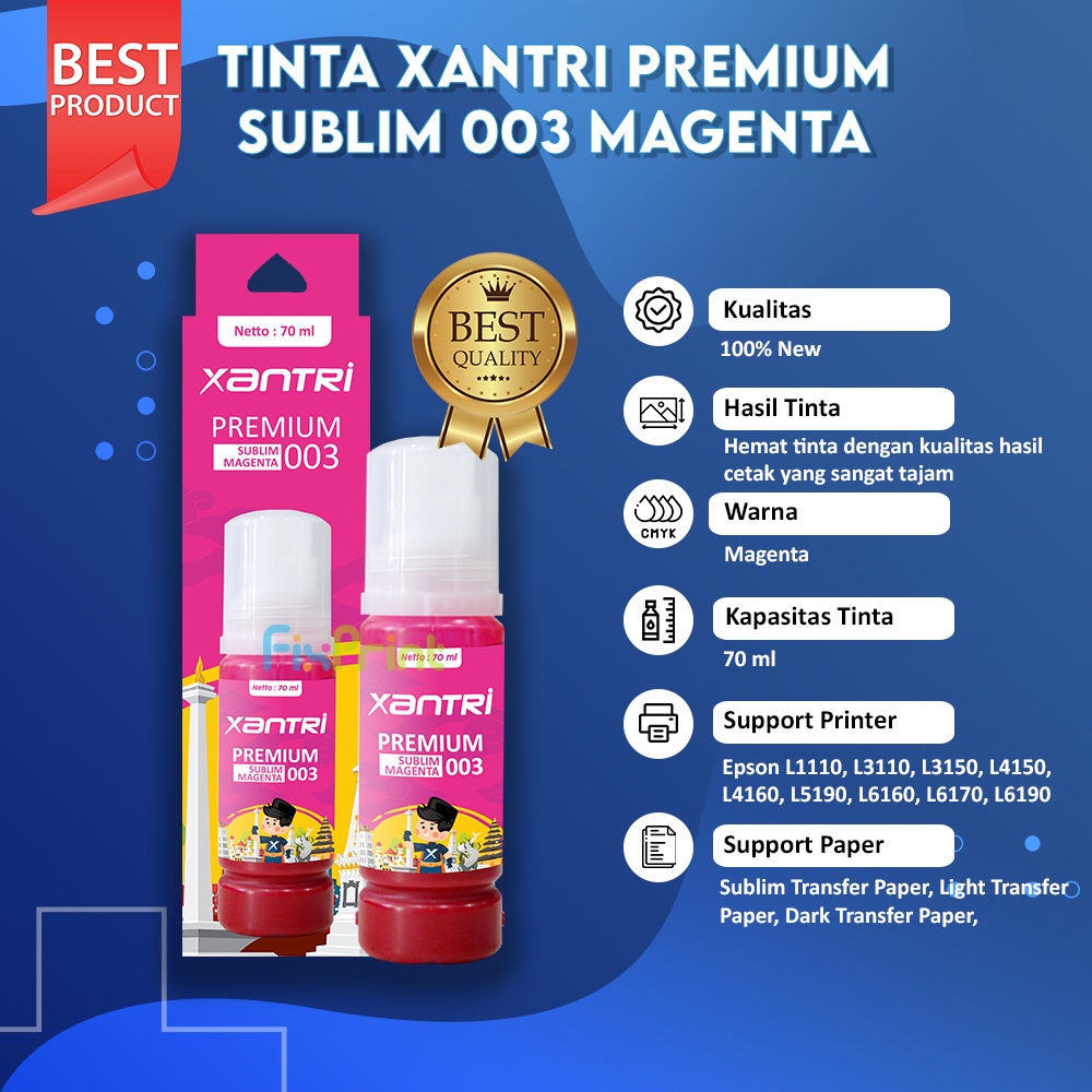 Kami memperkenalkan tinta PREMIUM XANTRI dengan harga terjangkau dan formula PRINT HEAD SAVER sehingga print head tidak mudah mampet, aman tidak digunakan lebih dari 30 hari, membuat usia print head lebih lama, dan hasil cetak yang tajam sempurna.