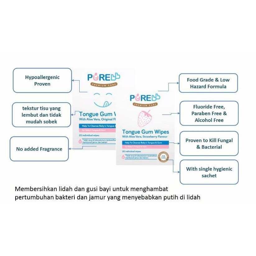 PureBB Tongue & Gum Wipes adalah tisu basah Higienis tanpa Alkohol dan tanpa Pemanis yang dikemas secara individual sachet & diformulasikan dengan teknologi Food Grade untuk membersihkan Gusi & Lidah Bayi dan mengurangi serta menghambat pertumbuhan jamur yang biasanya ditandai dengan adanya bercak putih di lidah bayi karena ASI atau Susu Formula