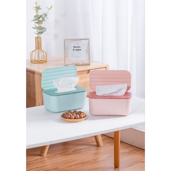 Kotak tissue yang terdapat penempel dinding di bagian bawah dan ada penahan di bagian dalam agar saat tissue tinggal sedikit mudah untuk diambil. Terdapat tutup di tissue bagian atas. Penempatan tissue atau masker dapat dimasukkan dengan kemasan plastiknya.