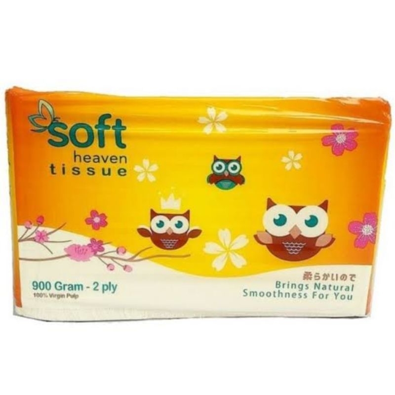 Tissue SOFT HEAVEN - Tisu facial berfungsi untuk membersihkan area wajah, mulut dan kulit tubuh dari keringat dan kotoran. . Terbuat dari 100% serat alami, higienis, lembut, berdaya serap tinggi dan alami - Tisu facial Soft Heaven nyaman di pakai untuk kulit anda. - Kualitas premium dan harga yg sangat terjangkau. - Tidak berbulu/rontok kecil2 saat dipakai menyeka keringat/kotoran di wajah atau bagian tubuh lainnya.