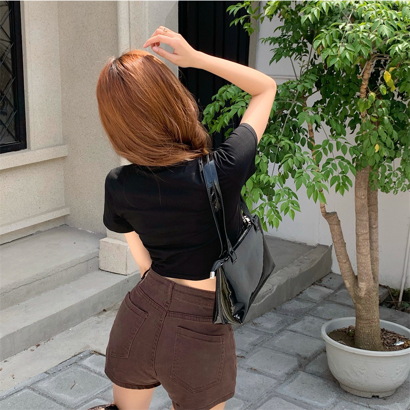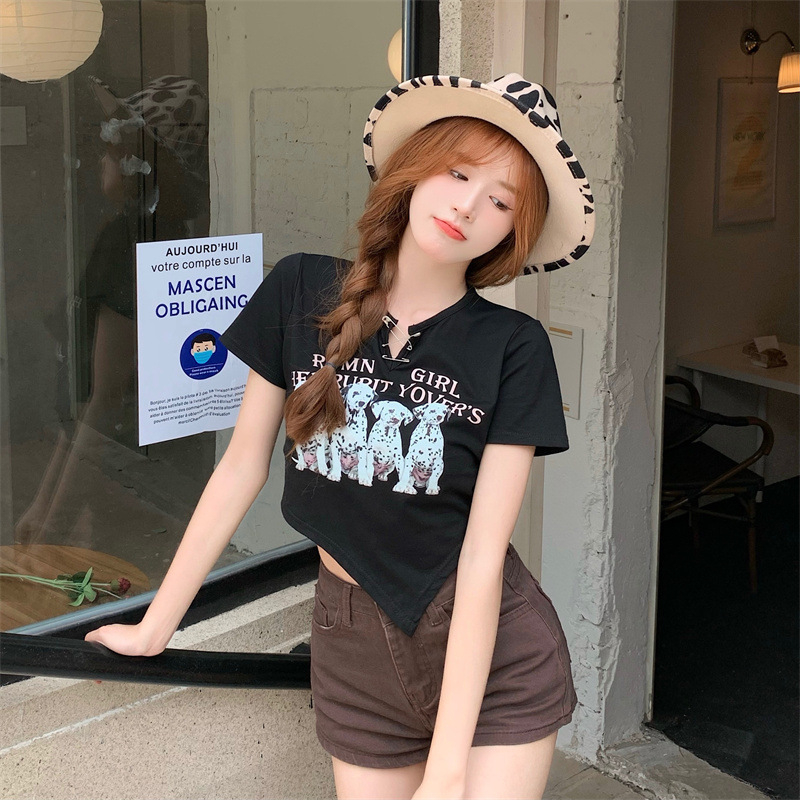Detail TJM BJ391 Baju Kaos Crop Top Printed Mix Button Pin Atasan Wanita Lengan Pendek Korean Style