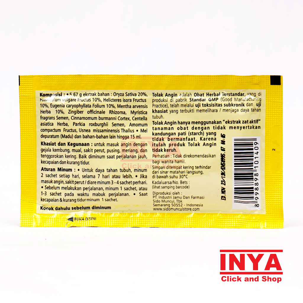 Khasiat dan Kegunaan : Untuk masuk angin dengan gejala kembung, mual, sakit perut, pusing, meriang dan tenggorokan kering. Baik diminum saat perjalanan jauh, kecapaian dan kurang tidur.