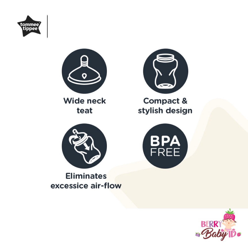 Tommee Tippe Closer to Nature Botol Bayi PP mempunyai kelebihan : - Dot leher yang lebar, lembut, dan lentur akan membuat bayi merasakan secara alami seperti menyusui langsung dari payudara ibu. - Dot Nipple Terbuat dari 100% Silikon Medical Grade - Teknologi katup ventilasi yang mengurangi udara penyerapan dalam botol membuat Kualitas Nutrisi ASI tidak menurun dan bayi lebih nyaman. - Bentuk botol Close to Nature yang compact akan memungkinkan bayi untuk lebih dekat dengan Ibu. - Bebas dari BPA dan bahan berbahaya lainnya, sangat aman digunakan untuk bayi. - Bentuk dot yang unik memungkinkan untuk melenturkan dan meregangkan. - Tahan terhadap suhu panas dengan temperature sampai dengan 120 derajat celcius - Cocok untuk direbus, di steam dan sterilisasi dengan air dingin.
