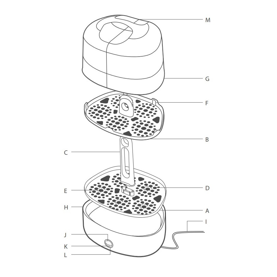 Cara Pakai: 1. Pastikan botol dan peralatan yang akan disteril telah dicuci bilas dengan sabun. 2. Tuang 80ml air ke bagian metal pemanas 3. Pasang dasar rak 4. Isi dengan peralatan yang berukuran relatif lebih besar 5. Pasang rak kedua dan letakkan peralatan yang berukuran relatif lebih kecil 6. Tekan tombol start 7. Setelah selesai tunggu dingin sekitar 3 menit 8. Peralatan akan tetap steril selama 24 jam jika tidak dibuka.