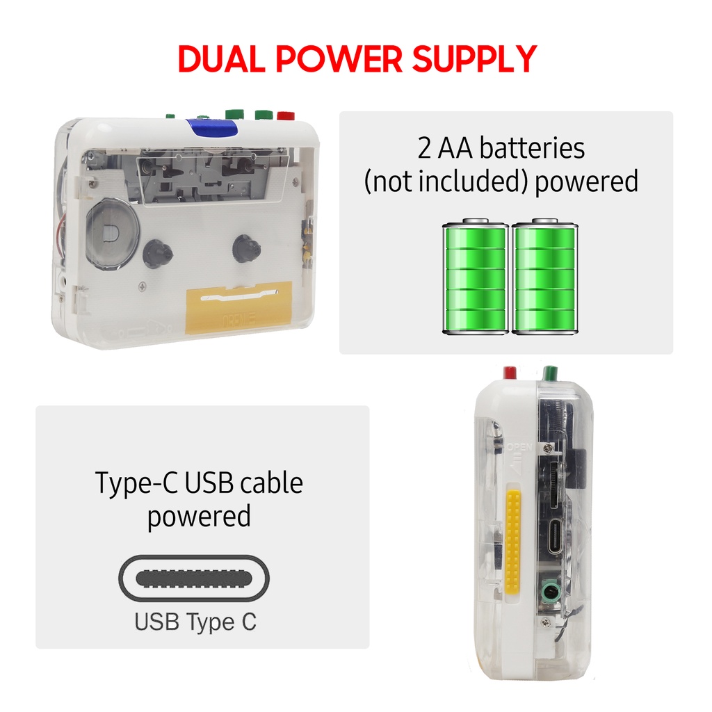 Fitur: Kaset ke Pemutar MP3: Ubah kaset campuran lama Anda dan kaset ke format MP3, Anda dapat memainkannya di pemutar MP3 mana pun, atau bakar ke CD untuk menyimpannya. Operasi Mudah: USB plug and play, dilengkapi dengan perangkat lunak konverter pita untuk membimbing Anda melalui Persyaratan Sistem transfer. Kompatibel dengan Wins XP/ Vista/ 7. Jack Earphone 3.5mm: Dilengkapi dengan sepasang Earphone untuk mendengarkan musik, yang membuat Anda merasa menyenangkan dan lebih fokus, dan tidak akan mengganggu orang lain. Catu Daya Ganda: 2 baterai AA (tidak termasuk) dioperasikan atau kabel USB Tipe-C bertenaga. Kompak & Cantik: Cangkang transparan, kancing berwarna-warni, penampilan ringkas dan indah. Ukuran Mini, portabel dan ringan untuk dibawa.