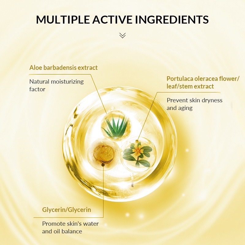 Features: Mengadung emas dan bahan esensial lainnya, Tekstur yang halus dan segar, menyerap dengan cepat dan mengembalikan kelembapan yang dibutuhkan kulit, melembabkan kulit dengan lembut, membantu meningkatkan kulit yang kering, mengembalikan dan mengunci air, membuat kulit bersit, halus, lembut, lembab dan bercahaya.