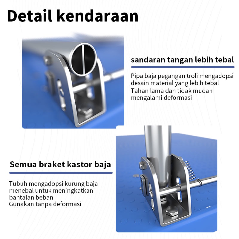 🎯Fitur🎯1. Gerobak 4 roda, lantai baja, model lipat2. Struktur terbuat dari baja (Steel) dan aluminium (Aluminium), kuat dan tahan lama.3. Pegangan berwarna biru terbuat dari bahan aluminium (Aluminium) pas di tangan.4. Kuning dilapisi karet hitam (Rubber), tebal, lembut, nyaman di dorong, tidak melukai tangan.5. Lantai gerobak terbuat dari baja yang dilapisi dengan kain karet anti selip. Menghilangkan masalah membawa benda berat, benda jatuh saat digunakan.6. Terdapat karet bumper di sekeliling mobil. Mencegah benturan dan kecelakaan7. Dua roda depan bisa berputar 360 derajat.8. Digunakan untuk memindahkan barang di dalam kantor, pabrik dan berbagai tempat.9. Pegangan bisa dilipat. menghemat ruang penyimpanan mudah dibawa10. Roda karet tebal, kuat, dapat digunakan di semua permukaan.