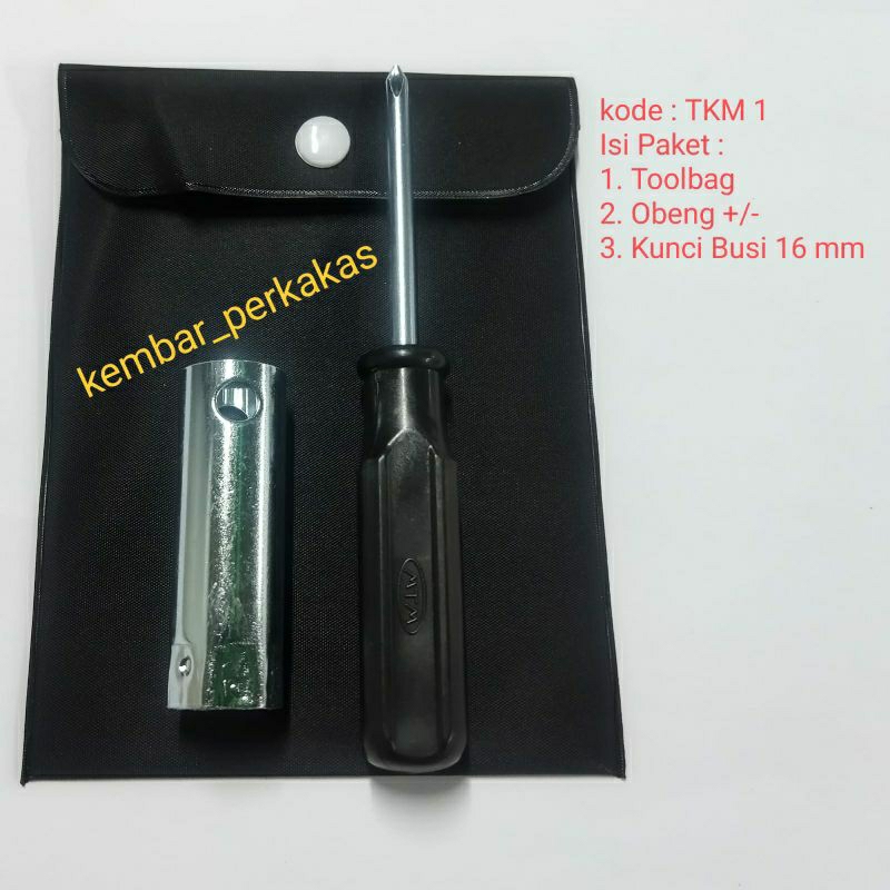 toolkit sepeda motor matic & bebek dibuat dengan bahan berkualitas sehingga tidak mudah rusak saat digunakan isi paket sesuai dengan variasi 1.toolbag 2.Obeng +/- 3.Kunci busi 16 mm 4.Kunci pas 8 x 10 5.Kunci pas 14 x 17 6.Tang 6 inch