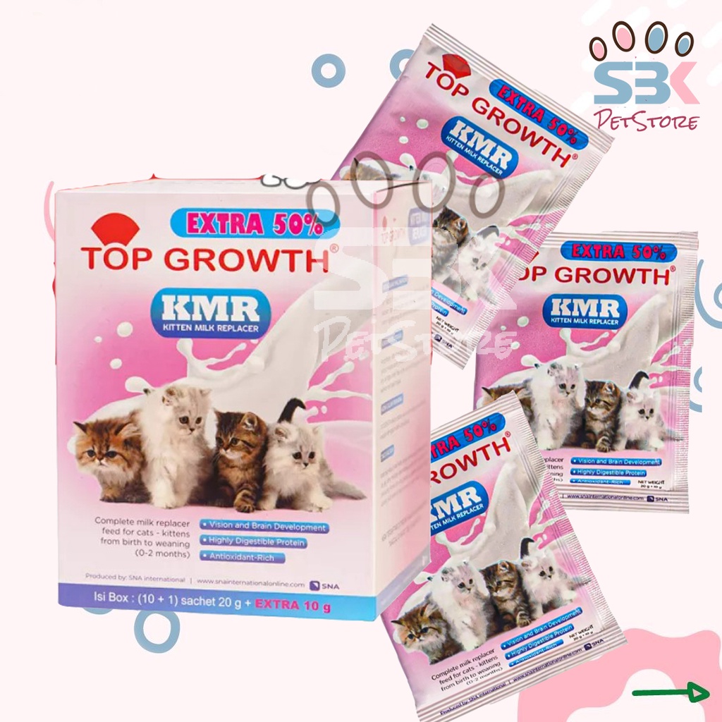 Top Growth Kitten Milk Replacer adalah susu kucing yang dapat digunakan sebagai makanan pengganti bagi anak kucing yang tidak menyusui langsung pada ibunya. Tidak seperti susu sapi, Top Growth Kitten Milk Replacer diformulasikan untuk memberikan keseimbangan yang baik dari semua nutrisi penting yang dibutuhkan oleh anak-anak kucing yang baru lahir.