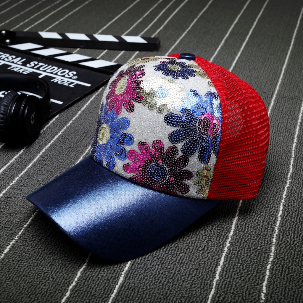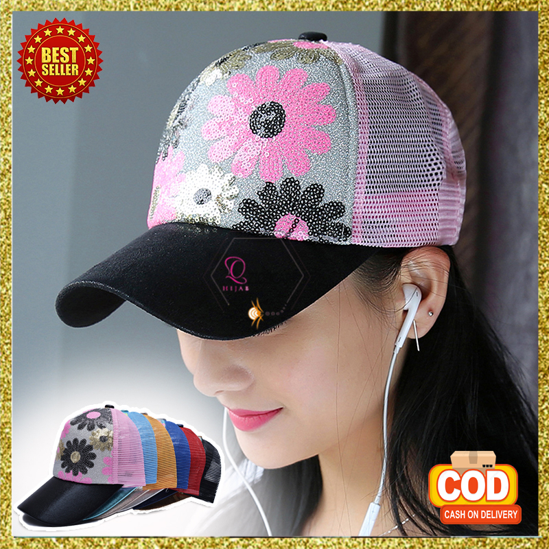 Topi Baseball Pria Wanita Motif Bunga Manik Sequin Trucker Hat Fashion Casual Sporty Trendy Kualitas Import