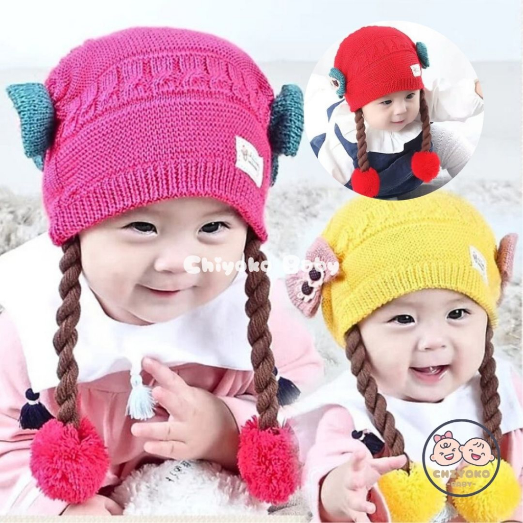 Topi Bayi Perempuan Rajut Pompom Model Kepang / Topi Rajut Premium Baby Girl model Kepang Chiyoko Baby