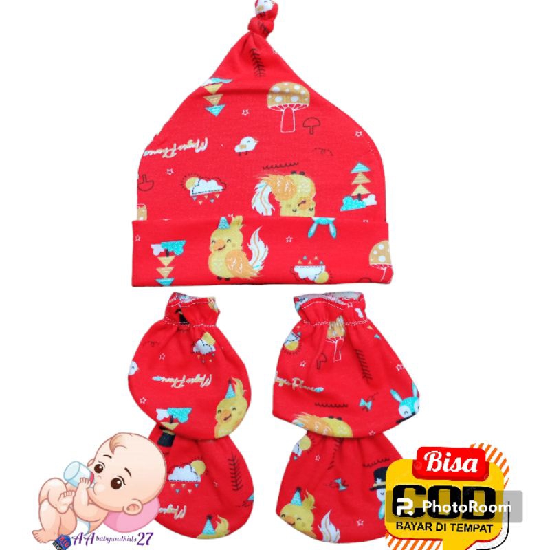 Detail TOPI BAYI PLUS SARUNG TANGAN DAN KAKI VINATA-TOPI SET BAYI VINATA FULL PRINT-TOPI BAYI SET VINATA