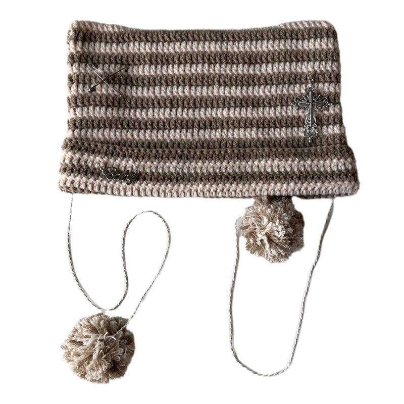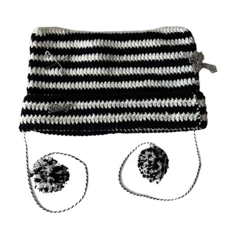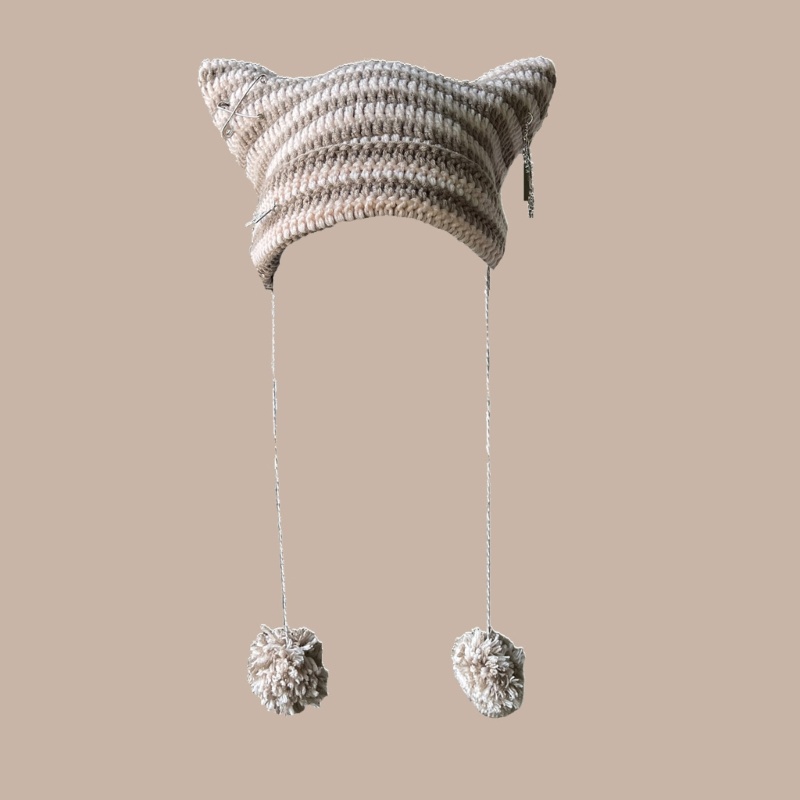 Detail Topi Beanie Rajut Motif Garis Aksen Telinga Kucing