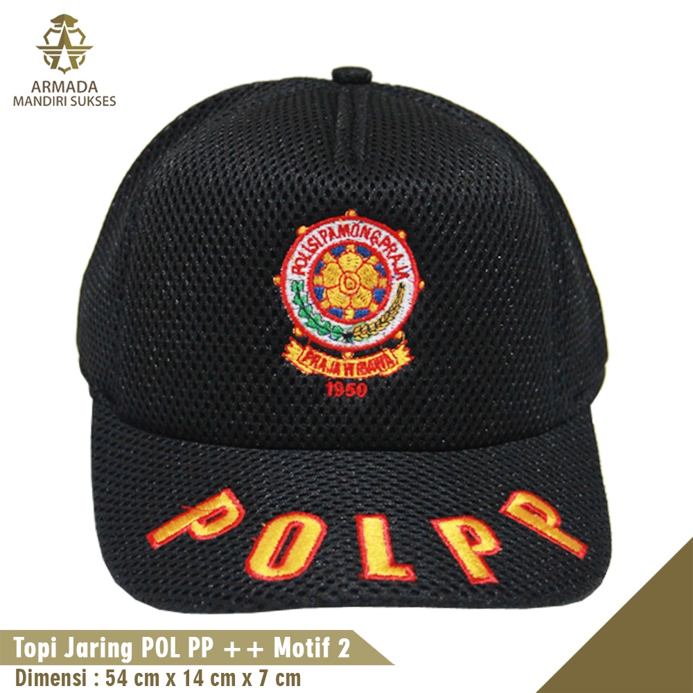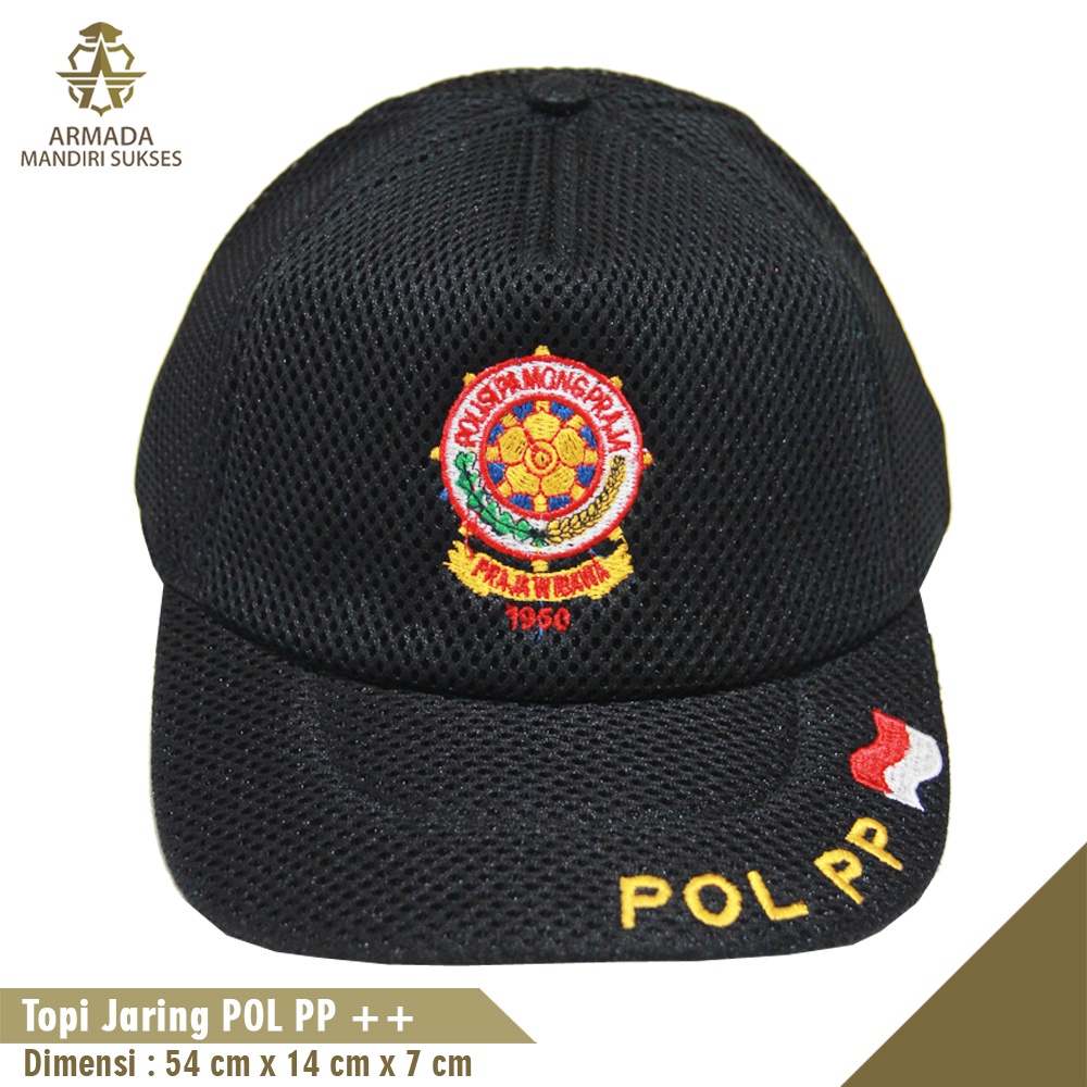 Spesifikasi : ✅ Bordir : Depan gambar logo Pamong Praja ✅ Bahan : Double mesh / jaring ✅ Warna topi : Hitam ✅ Model tulisan : Besar, kecil bendera