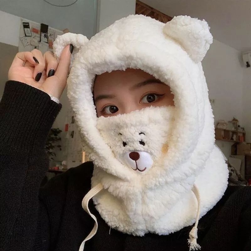 Aksesoris Fashion > Topi > Beanies > topi kupluk masker bear kawaii 2in1 serut / Topi Kupluk Plush Gaya Korea Aksen Telinga Beruang Untuk Anak Perempuan kepala beruang tali dagu