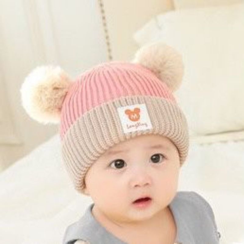 Topi kupluk kombinasi 2 warna pom pom Bahan rajut Cocok untuk usia 0-3 Tahun Lingkar kepala 30-50 CM