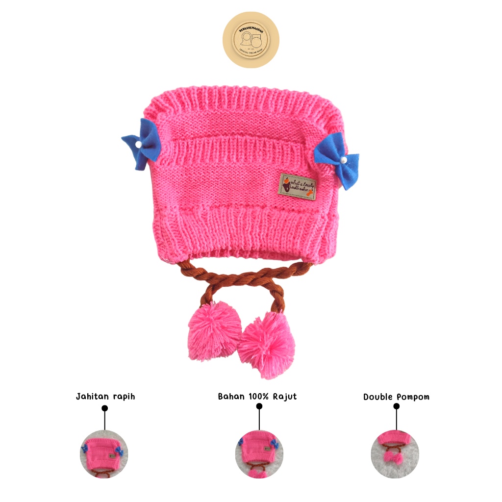 Bahan : 100% Rajut Usia yang berlaku : 0 bulan hingga 3thn Fitur : Berpori, Menghangatkan kepala, Ringan, nyaman untuk di gunakan Tinggi = -+ 17cm