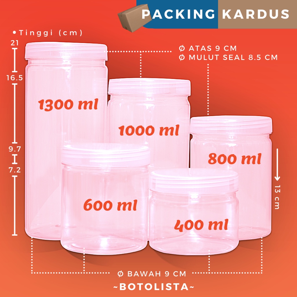 Perlengkapan Rumah > Peralatan Dapur > Tempat Penyimpanan Makanan > Toples Plastik 400 ml, 500ml, 600ml, 800ml, 1000ml, 1300ml. Toples Plastik Silinder