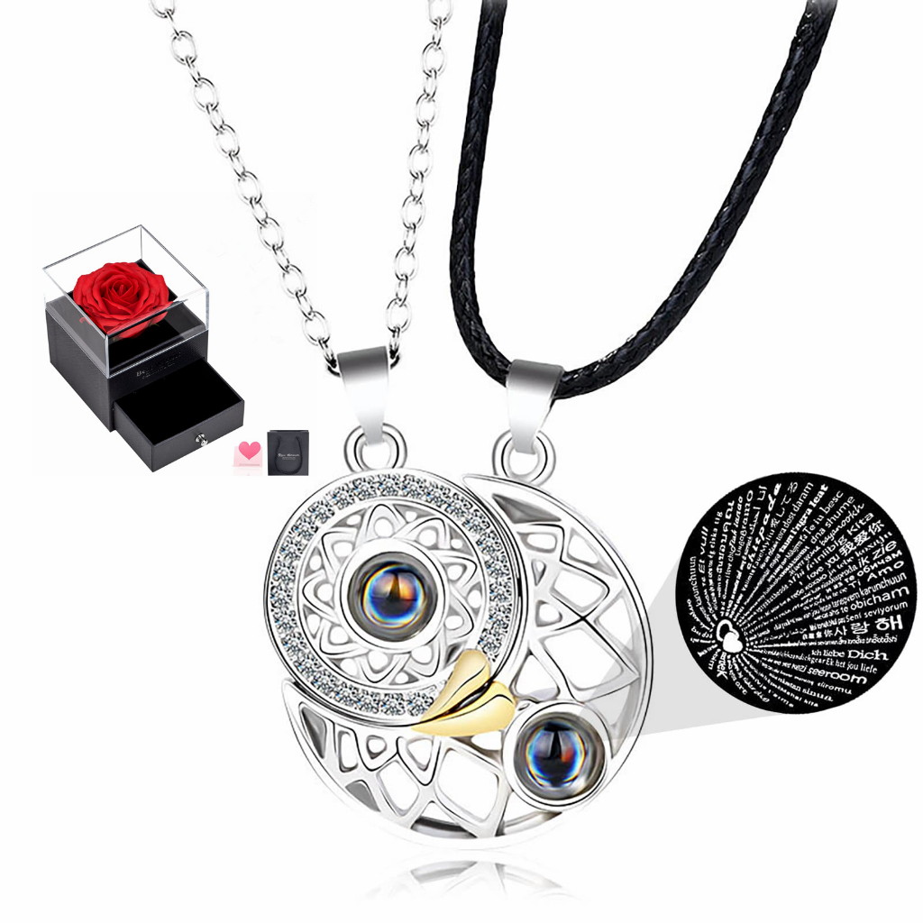 Aksesoris Fashion > Kalung > Topspot 925 perak Kalung Magnetik Untuk Pasangan 100 Bahasa I Love You Kalung Gelang Cincin Set untuknya 100 Bahasa Memori Proyeksi Kalung Bulan Sabit Setengah Bulan Matahari untuk Wanita Pria Teman Chrismtas dengan Kotak Hadiah Mawar Asli yang Diawetkan