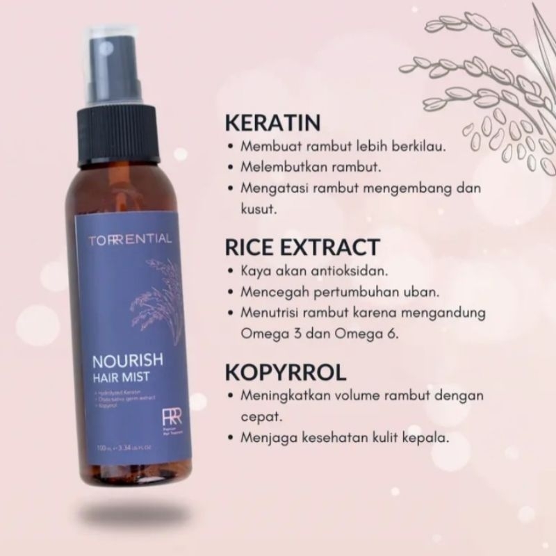 Nourish Hair Mist merupakan produk perawatan rambut berbentuk spray dengan formulasi terbaik seperti Keratin, Rice Extract dan Kopyrol yang berfungsi untuk merawat, menutrisi sekaligus melembapkan batang rambut hingga akar rambut.