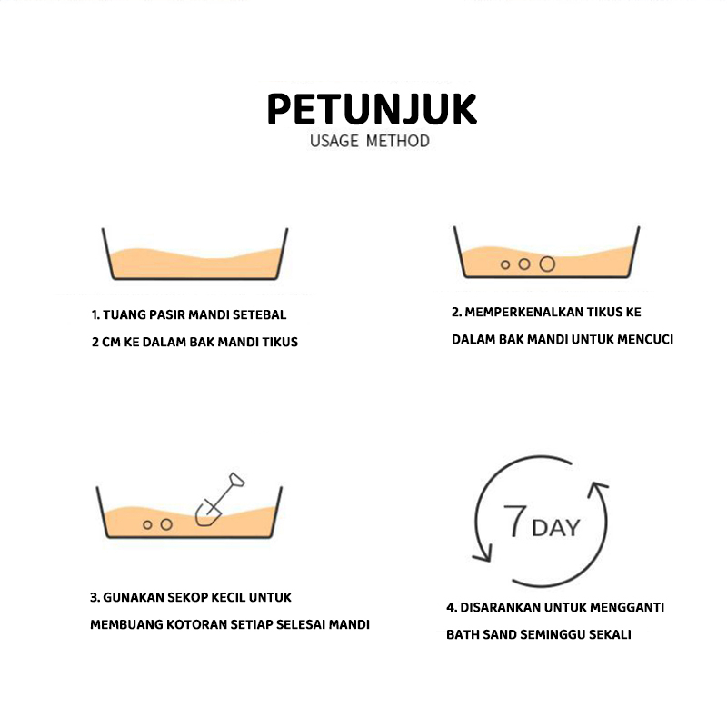 TOSAND Bathing Sand Pasir Mandi Hamster 500 + 100 GR Pasir mandi Hamster untuk menjaga agar bulu tidak lembab dan menjadikan bulu hamster tetap bersih dan lembut. Diproses dengan sterilisasi suhu tinggi • Tetap bersih dan kering dengan aroma yang menyegarkan • Dapat meminimalkan kemungkinan rambut rontok atau menderita dermatosis • Meningkatkan kesehatan dengan menggulirkan olahraga di bak mandi • Lebih sedikit debu dapat menghindari iritasi pada sistem pernapasan dan mata hamster • Deodoran • Anti jamur • Aroma Menyegarkan • Anti-dermatologi