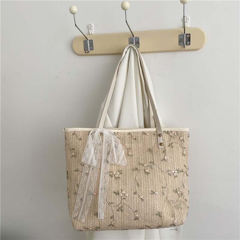Detail Totebag Kuliah Bahan Anyam Jerami Lace Leaf Korean Style Import