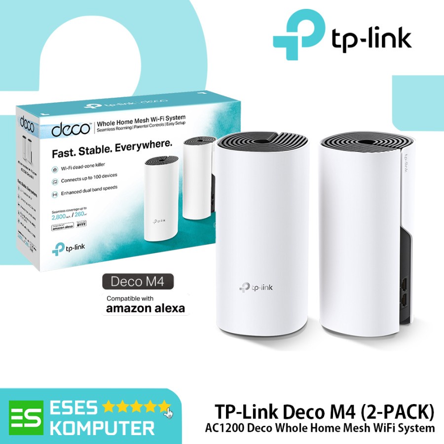 Fitur : • Whole Home Coverage: Deco M4 uses a system of units to achieve seamless whole-home WiFi coverage up to 5,500 sq. ft. — eliminate weak signal areas once and for all! • TP-Link Mesh Technology: With advanced Deco Mesh Technology, units work together to form a unified network with a single network name. Devices automatically switch between Decos as you move through your home for the fastest possible speeds • Fast Dual-Band WiFi: Deco M4 provides fast and stable connections with speeds of up to 1167 Mbps and works with major internet service provider (ISP) and modem. • Connect More Devices: Deco can handle traffic from even the busiest of networks, providing lag-free connections for up to 100 devices.* • Parental Controls: Limit online time and block inappropriate websites according to unique profiles created for each family member. • Easy Setup: Setup is easier than ever with the Deco app there to walk you through every step.