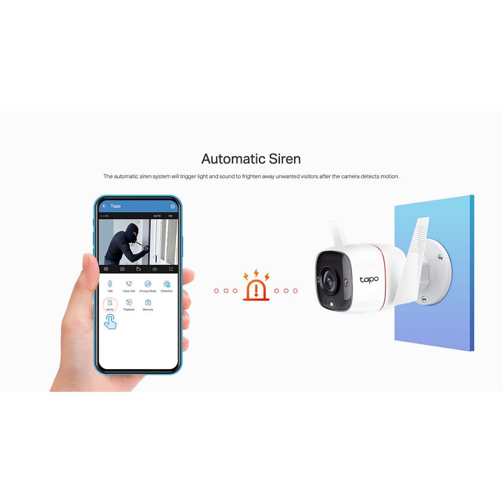 Sirene Otomatis Sistem sirene otomatis akan memicu cahaya dan suara untuk menakut-nakuti pengunjung yang tidak diinginkan setelah kamera mendeteksi gerakan.