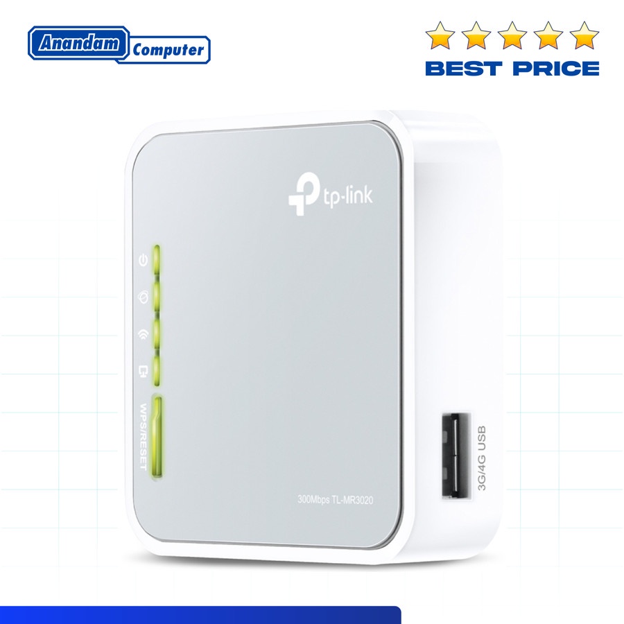 Spesifikasi : - Plug in 3G/4G USB modem to share your Wi-Fi connections, the compatibility is assured via years of field tests - Portable and elegant, providing carry-on wireless connections for business travel and family trips 300 Mbps Wi-Fi speeds meet your daily internet needs - One button switches from 3G/4G, AP and WISP modes, for access internet everywhere - Power via your laptop's USB port, a USB power adapter or a smartphone charger - 3G/4G and WAN fail-over backup strategy ensures TL-MR3020 provides a sustained internet connection